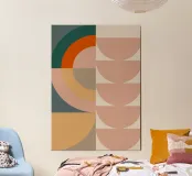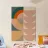 "Fall" is a modern abstract composition that harmoniously blends organic and geometric forms with a warm, autumnal palette. The left side features large, sweeping curves in burnt orange, deep teal, and ochre, evoking natural elements like changing leaves and a setting sun. This is balanced by the right side's clean, rhythmic pattern of four stacked semi-circles in a soft, dusty rose. The interplay between the flowing arcs and the structured repetition, all unified by a peaceful, earthy color scheme, creates a serene and contemporary visual ode to the quiet beauty of the season.
