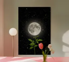 This captivating print features a full moon, bathed in a soft, golden glow, against a deep black backdrop. Two elegant, stylized flowers, one with dark, almost iridescent petals and the other with delicate, golden leaves, stand tall beneath the lunar orb. The interplay of light and dark, combined with the intricate details of the floral elements, creates a truly mesmerizing piece that will add a touch of celestial beauty to any space.