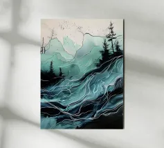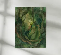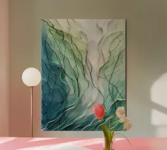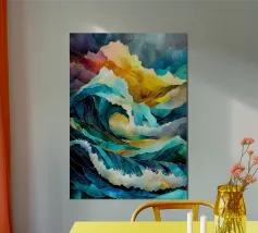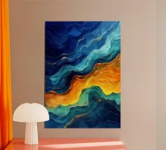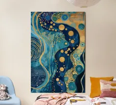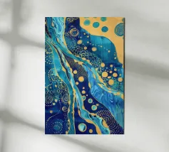 A mesmerizing abstract artwork featuring swirling, vibrant hues of blue, green, and gold. The intricate lines and patterns evoke a sense of cosmic depth and ethereal beauty. This piece is perfect for adding a touch of elegance and sophistication to any space.