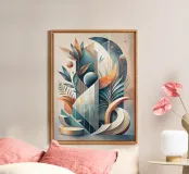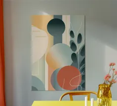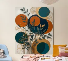 A captivating abstract artwork that blends organic and geometric elements. Lush foliage intertwines with celestial bodies and architectural forms, creating a sense of harmony and balance. The muted color palette and intricate details invite contemplation and exploration.