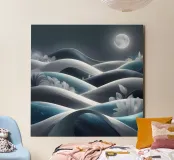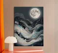 A serene and ethereal landscape bathed in moonlight, featuring rolling hills, delicate white flowers, and shimmering stars.