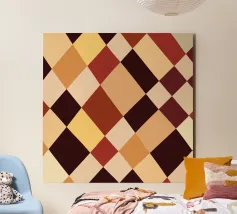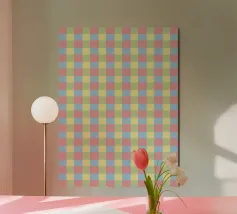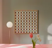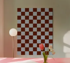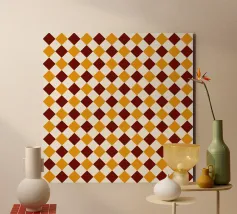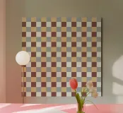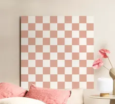 A pattern of alternating colored squares creates a checkerboard effect with shades of beige, gray, and brown. The grid-like design is symmetrical and evenly spaced.