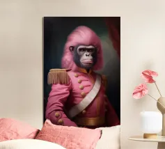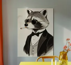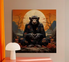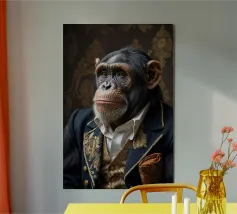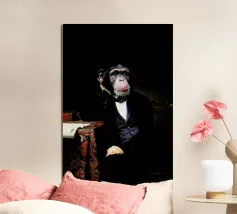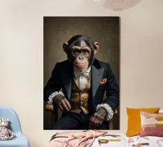 A charismatic chimpanzee dressed in a classic black tuxedo, sitting confidently in an armchair while smoking a cigar. The image combines humor, surrealism, and elegance with a smoky atmospheric background.