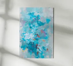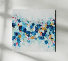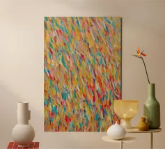 This image depicts an abstract painting characterized by a multitude of short, vertical brushstrokes in a variety of colors set against a soft blue background. The strokes create a textured and rhythmic surface that gives the impression of gentle movement or perhaps falling rain. There is a sense of depth created by the layering of paint, with hints of warmer tones peeking through cooler ones. The overall effect is calming and reminiscent of nature's elements, evoking feelings similar to watching light reflections on water or leaves rustling in the breeze.