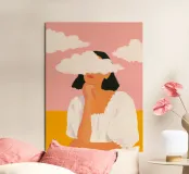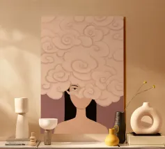 A dreamy and surreal illustration portraying a woman with soft white clouds gently drifting across her eyes. Set against a warm pink sky and golden landscape, the composition blends bold color fields with rich painterly textures to create a striking, contemplative scene.