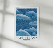 clouds dots Japanese text blue background white dots name text museum text sky exhibition artist name exhibit poster typography dotted pattern graphic design text layout art exhibit illustration poster design geometric shapes title text