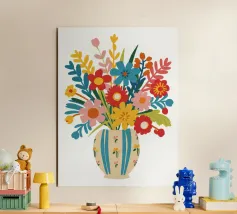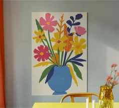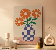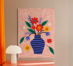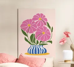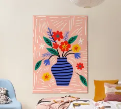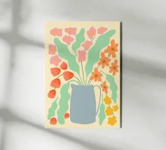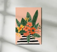 A vibrant bouquet of flowers in warm shades of red and pink, framed by green leaves and a striped vase design. This motif radiates joie de vivre and elegance and brings a touch of nature into your home. Perfect for products such as wall murals, cushions, mugs or mobile phone cases, this floral design is a stylish addition to any room or an ideal gift for flower lovers.