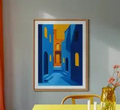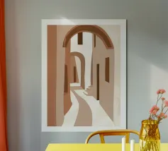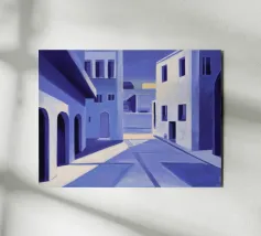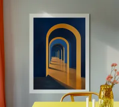 Abstract architectural illustration combining vibrant shades of blue and orange, depicting a play of light and shadow in a maze of buildings with geometric arches and windows. This minimalist, modern design evokes a Mediterranean ambience while capturing a contemporary aesthetic. Perfect for adding a touch of dynamism and sophistication to a space or art project.