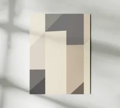 Geometric shapes in neutral tones create an abstract composition with overlapping triangles and a central square. The interplay of light and shadow adds depth to the minimalist design.