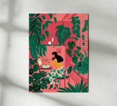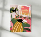 This painting depicts a person sitting at a desk with various plants and art supplies. The person is wearing a yellow plaid shirt and appears to be deep in thought, looking out the window at a colorful sunset. A black cat is perched on the windowsill, adding a touch of whimsy to the scene.