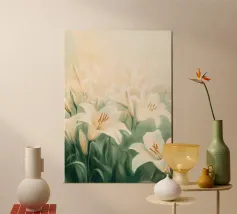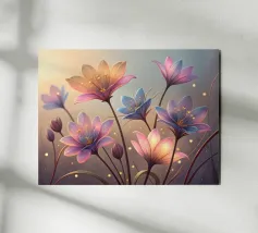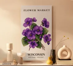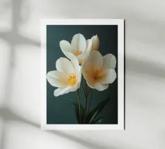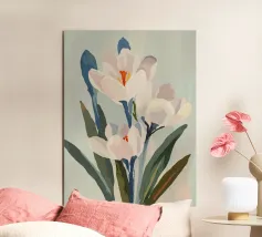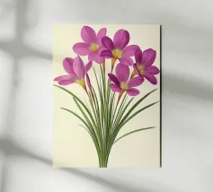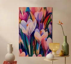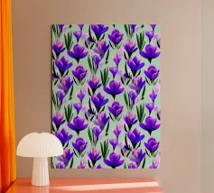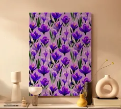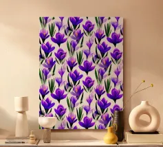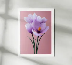 Illustration détaillée de crocus violets épanouis avec des pistils jaunes éclatants, capturant la beauté subtile du printemps. Parfait pour une décoration murale élégante et naturelle.