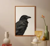 This black-and-white photography print showcases the intricate details of the crow's feathers and piercing eyes. deal for bird lovers and fans of nature-inspired art, this unique crow print adds a touch of sophistication and intrigue to your space.
