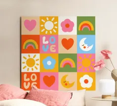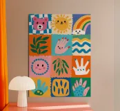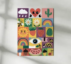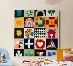 A colorful patchwork quilt design featuring cute characters like a sun, a rainbow, a lion, a bunny, and abstract hands on checkered backgrounds.