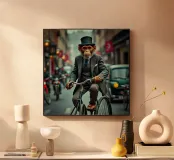 Monkey on Penny-Farthing Bicycle in Victorian Street A charming monkey in a three-piece suit navigates a bustling Victorian-era street on a vintage penny-farthing bicycle, with vivid colors and sharp detail reminiscent of hyperrealistic art.