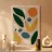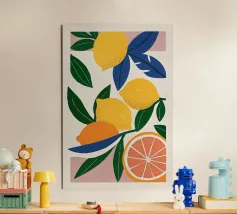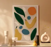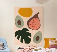 This abstract artwork deconstructs fruits like pears and oranges into their basic organic shapes and colors. The overlapping forms in a palette of ochre, blue, and green create a modern and sophisticated composition that is a subtle nod to a classic still life.