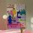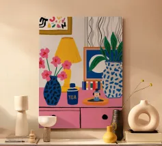 A quirky desk with pink lamp, vase flowers, matryoshka, and tea brings playful personality.