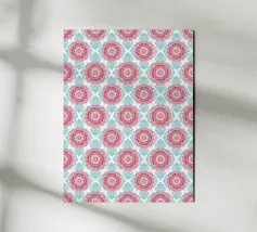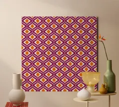 A repeating pattern features diamond shapes in soft pink and white against a light blue background, creating a geometric design. The arrangement of the shapes provides a sense of rhythm and harmony.