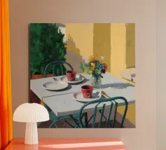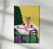 A simple, modern interior scene of a table set for two, with a vase of flowers as a centerpiece. The yellow wall and minimalist setting create an atmosphere of quiet intimacy and chic simplicity.