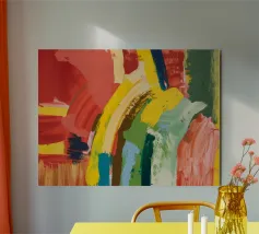 Bold swirls of blue and green intertwine with vibrant red and orange, creating a dynamic and energetic composition. Abstract forms and broad brushstrokes evoke a sense of motion and fluidity