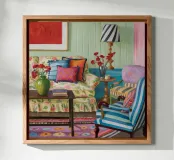 A vibrant, eclectic parlor filled with a mix of patterns and colors. A floral sofa, a striped armchair, and patterned wallpaper create a maximalist's dream, full of personality and creative energy.