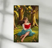 A person sits on the grass in a serene forest, engrossed in a book. Warm golden light filters through the trees, creating a magical and tranquil atmosphere.