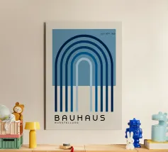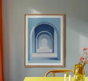 A minimalist, modern illustration of a series of blue arches, creating an infinite, soothing perspective. The design plays on soft, luminous tones, offering a clean, contemporary architectural aesthetic. Perfect for evoking an atmosphere of serenity and depth, this visual captures the beauty of geometric lines and the play of shadows with timeless elegance.