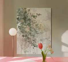 This minimal composition of spontaneous splashes, fine specks, and brisk ink marks recalls botanical sketches caught in motion. The muted greens and soil-browns drift like windblown leaves across a pale ground—studied yet wild, like nature annotated in shorthand.