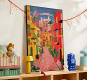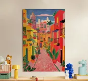This painting captures the joie de vivre of a Mediterranean alleyway: bright façades in yellow, pink and red, lush potted plants and a sky in rich blue. The depth of perspective invites the eye into the scene, while the vibrant colour palette is reminiscent of southern warmth, summer and serenity. Perfect for anyone who wants to feel Mediterranean flair and good humour on their wall.