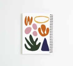A minimalist abstract composition of various organic shapes in terracotta, blue, and black, floating on a white background, creating a sense of light and balance.