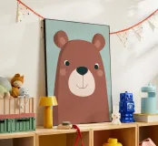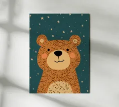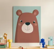 A cheerful minimalist illustration of a brown bear, featuring smooth shapes, gentle facial details, and a calm pastel background. The balanced composition and warm color palette create a welcoming, cozy feeling that suits nurseries, children’s rooms, and modern Scandinavian-style interiors. A timeless and friendly artwork that brings warmth and quiet joy to any space.