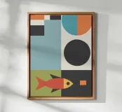 A geometric composition features a stylized orange fish against a backdrop of colored rectangles and circles, blending teal, black, and green shades. Bold shapes and contrasting colors create a modern, abstract aesthetic.