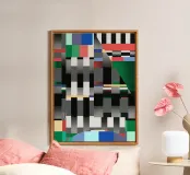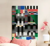 Bold geometric shapes dominate the composition, featuring a mix of colors and patterns such as stripes and checkered designs. The arrangement creates a vibrant and dynamic visual experience.