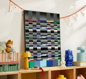 A series of horizontal and vertical geometric patterns creates a mesmerizing optical illusion with various shades and colors. The composition is structured with contrasting blocks, lines, and grids, providing a modern and dynamic visual experience.
