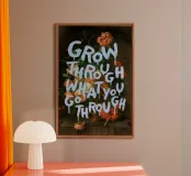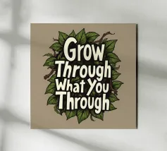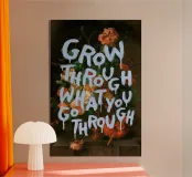 This poster combines an old floral still life with a motivational quote. Soft pastel colors and rich tones show a bouquet of flowers overlaid with the saying "Grow Through What You Go Through" in bright blue.