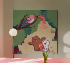 This artwork depicts a grumpy-looking cloud with a thought bubble containing a bird and a bear. The humorous and imaginative scene is set against a soft blue background.