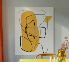 This abstract artwork feels like a spontaneous, improvisational sketch. Flowing black lines and scribbles interplay with a block of warm yellow and a textured beige background, creating a piece that explores movement, line, and form with a free, expressive energy.