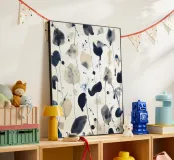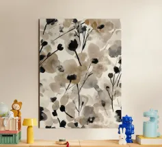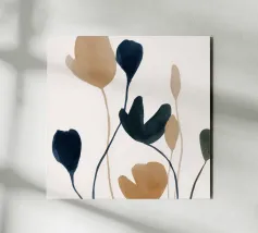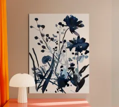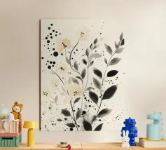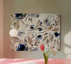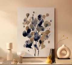 A lively botanical abstraction composed of soft indigo and warm taupe washes drifting across a bright white backdrop. Long, delicate stems anchor the floating leaf forms, while energetic splatter textures bring movement and spontaneity to the piece. The balance of airy translucence and deep inky tones creates a modern, calming rhythm. Ideal for contemporary, minimalist, or spa-inspired interiors, this artwork adds freshness, subtle motion, and an elevated natural feel to any space.