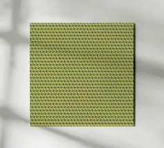 A complex pattern of interlocking shapes in red, teal, and white creates a grid-like optical illusion. The repetitive geometric design adds a sense of movement and depth.