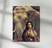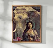 An elaborately dressed woman is depicted in front of an elephant, surrounded by pink lotus flowers. The scene conveys a sense of serenity and connection with nature, emphasizing cultural and spiritual elements. A regal woman adorned with jewelry sits gracefully in front of a majestic elephant, surrounded by blooming lotus flowers. The scene exudes a sense of tranquility and power, reflecting the harmonious relationship between humans and nature. Isha, a primal force – still, yet unshakable. Not loud, but powerful in her presence. Strength rests in her gaze. Wild, wise and beautiful.