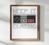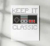 A retro gaming controller is depicted with the phrase "KEEP IT CLASSIC" in pixelated text. The design evokes nostalgia through its vintage aesthetic and simple color palette.