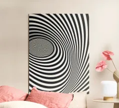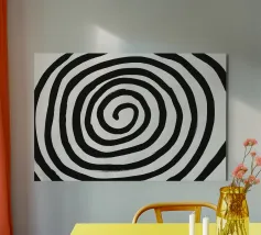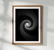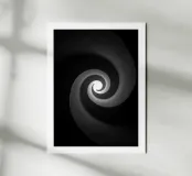 A black and white poster depicting a sculpted spiral leading the eye towards a luminous heart. Mineral texture, soft gradations and deep contrast create an illusion of hypnotic movement, both zen and graphic. This minimalist wall poster adds depth, mystery and modernity to the living room, bedroom or office, and complements contemporary, Scandinavian, industrial or Japandi interiors.