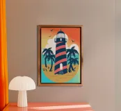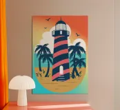 lighthouse palms tropical-beach coastline birds sunset-sky soft-sand sea-horizon clouds stairs observation-deck lighthouse-window lighthouse-tower striped-pattern silhouetted-palms dusk-atmosphere calm-sea beach-vacation ocean-view coastal-scene