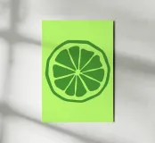 A stylized green lime slice with bold, clean lines stands out against a lighter green background. The simple design emphasizes the segments and rind of the lime.