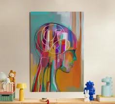 A dark, faceless portrait rises from a background of vivid colours. The eyes are obscured by an expressive wiping movement of blue and red, as if perception were being distorted or interrupted. The picture symbolises the lack of clarity of thought, repressed memories or a blocked view of reality. The intense colour contrasts and flowing brushstrokes lend the artwork a deep emotional tension.