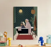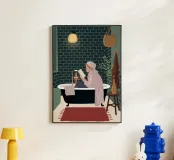 The painting portrays a person relaxing in a vintage-style bathtub, surrounded by a dark green tiled bathroom. They are reading a book, with a towel wrapped around their head. The warm lighting and elegant decor create a luxurious and tranquil atmosphere.