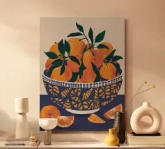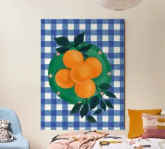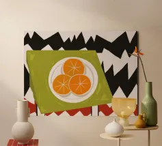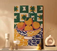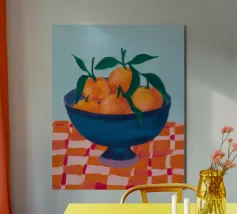 Mandarin oranges in a glass bowl atop geometric patterned cloth combine freshness and boldness.