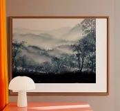 A misty, tonal landscape of silhouetted trees and softened mountain layers, this expressive watercolor evokes quiet mornings, distant ridgelines, and the hush of untouched wilderness. Perfect for modern interiors seeking stillness, depth, and natural mystery.