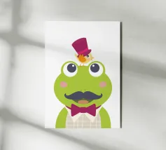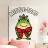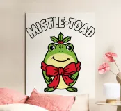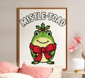 A cheerful green toad is adorned with a festive red bow, sitting happily beneath the words "Mistle-Toad" The scene suggests a playful holiday theme, with mistletoe positioned above the toad's head.