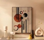This impressive design combines geometric shapes with a warm colour palette of earth tones, black and red. The combination of vertical lines, circles and curved elements creates a harmonious balance between structure and dynamism. Perfect for murals, mugs, mobile phone cases or cushions - a must-have for modern art lovers who want to add a timeless, artistic touch to their home or everyday life.