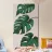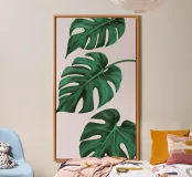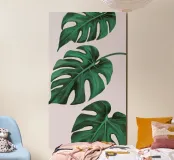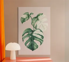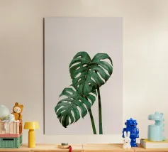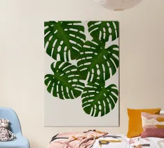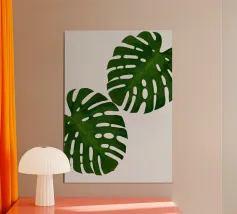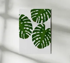 A close up illustration focusing on the iconic, fenestrated leaves of a monstera plant against a pale pink background. The composition is a simple, elegant, and minimalist study of a beloved natural form.